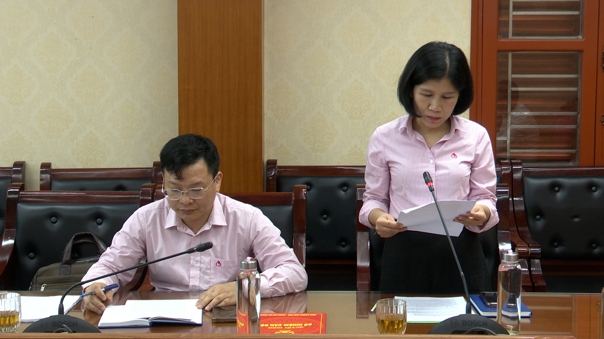 Đồng chí Lê Thị Uyên, Giám đốc Phòng giao dịch NHCSXH Kinh Môn thông qua báo cáo phân công nhiệm vụ của các thành viên và báo cáo tình hình hoạt động của NHCSXH