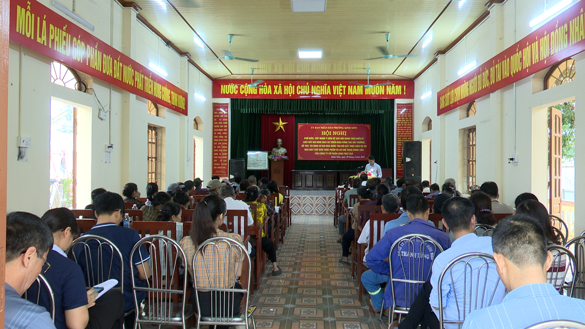 Ngày 18/4, UBND phường Kinh Môn chủ trì, phối hợp với Ủy ban MTTQ phường, Hội đồng bồi thường, hỗ trợ, tái định cư phường và các cơ quan liên quan tổ chức hội nghị phổ biến, tiếp nhận ý kiến về các nội dung theo Khoản 1 Điều 87 Luật Đất đai năm 2024, đồng thời triển khai công tác bồi thường, hỗ trợ, tái định cư khi Nhà nước thu hồi đất thực hiện Dự án Nhà máy chế biến thực phẩm và sơ chế nông sản của Công ty Cổ phần Long Phát QLC.