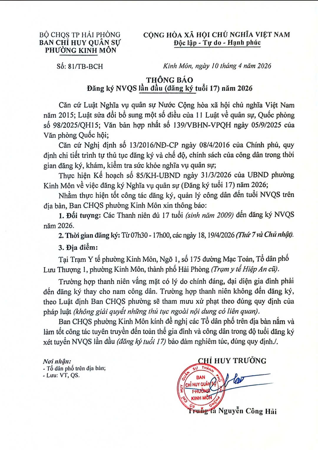 Nhằm thực hiện tốt công tác quản lý công dân trong độ tuổi thực hiện nghĩa vụ quân sự, bảo đảm chặt chẽ, đúng quy định của pháp luật, Ban Chỉ huy Quân sự phường Kinh Môn thông báo kế hoạch đăng ký Nghĩa vụ quân sự lần đầu (tuổi 17) năm 2026 như sau: